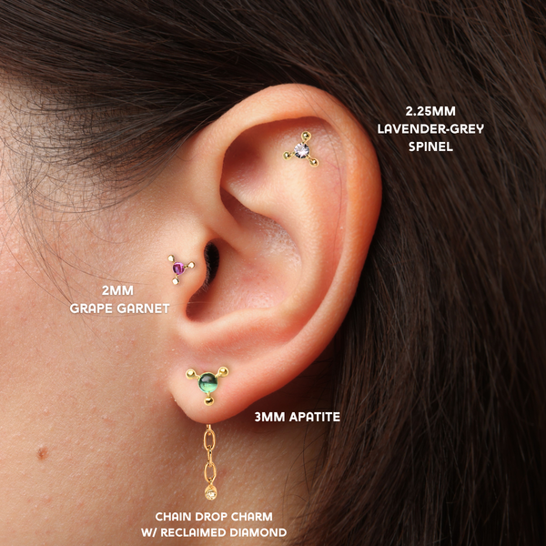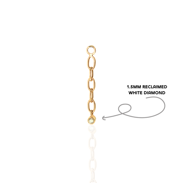 A little shine goes a long way with this bezel-set reclaimed 1.5mm white diamond, dangling beneath polished elongated-cable chain links. Perfect to slip on to the front or back of a stud (or seamless hoop) when you want to add a little bit of light-catching length💫